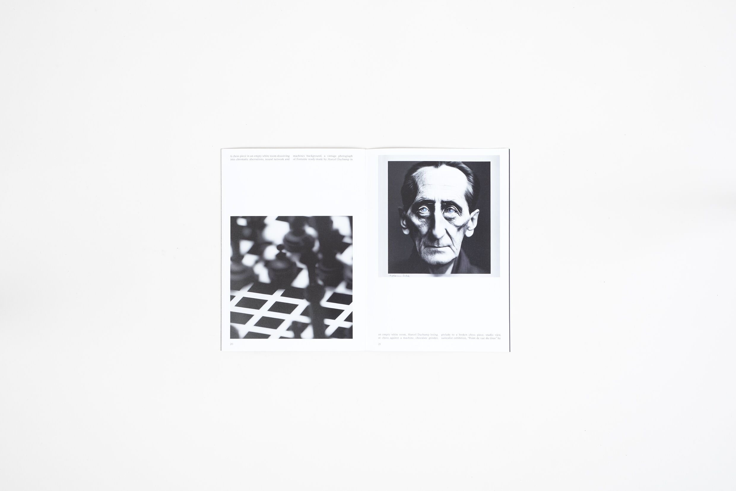 The book plays with the strange parallels between photography, readymades, chess and artificial intelligence; Photography threatens the livelihoods of painters. Duchamp dedicated his life to become a chess Grand Master. Deep Blue beats the greatest chess player, only to be itself replaced by better aritificial intelligence. Now AI is seen again as a threat to the role of artists, just as photography was before. Every step of the story is inhabited by the human fear of one day becoming obsolete, replaced by ever more powerful machines.